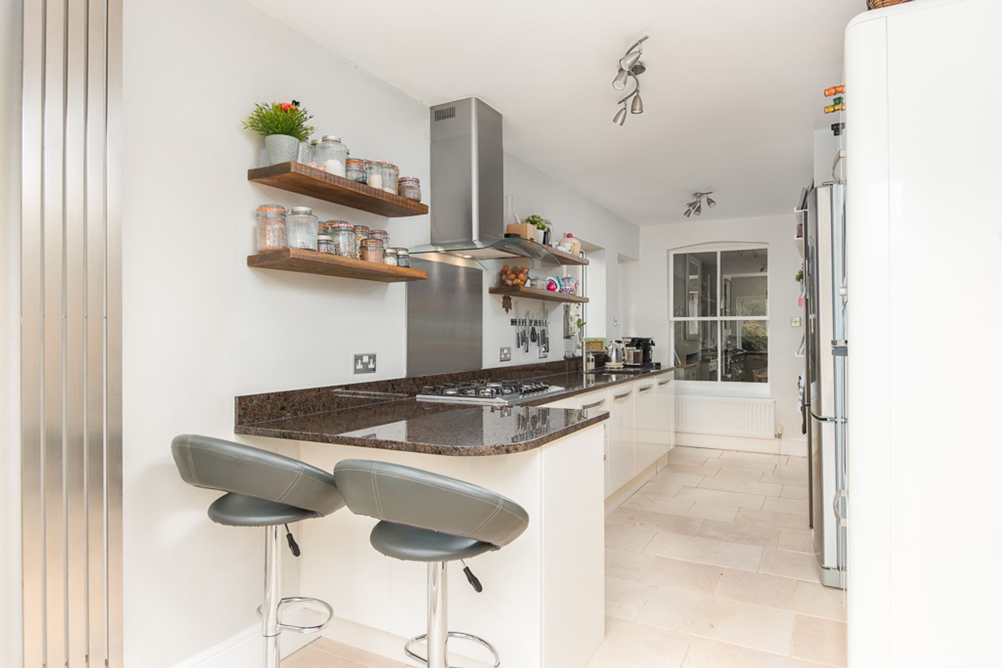 The kitchen is a bright and stylish hub of the home, featuring white cabinetry beautifully contrasted with stainless steel fittings and granite worktops. A cream tiled travertine floor adds warmth and practicality, while shelving provides both function and a contemporary touch. A charming wood-framed feature window looks through to the living area, creating a sense of connection between the spaces. Bifold doors open directly onto the garden, flooding the room with natural light and offering lovely views for relaxed family mornings. The breakfast bar provides an ideal spot for casual dining, and the kitchen is fully equipped with quality appliances including a Bosch double oven and gas hob, making it perfect for everyday cooking and entertaining.