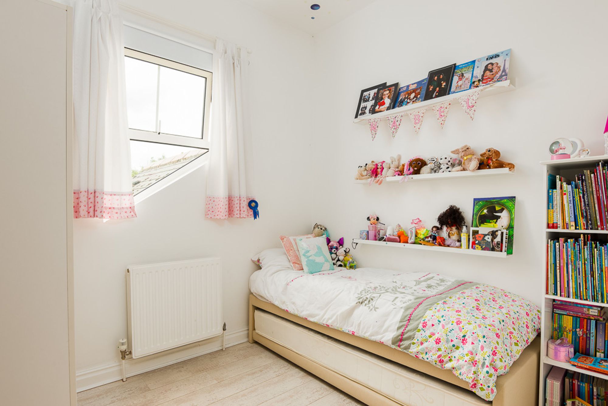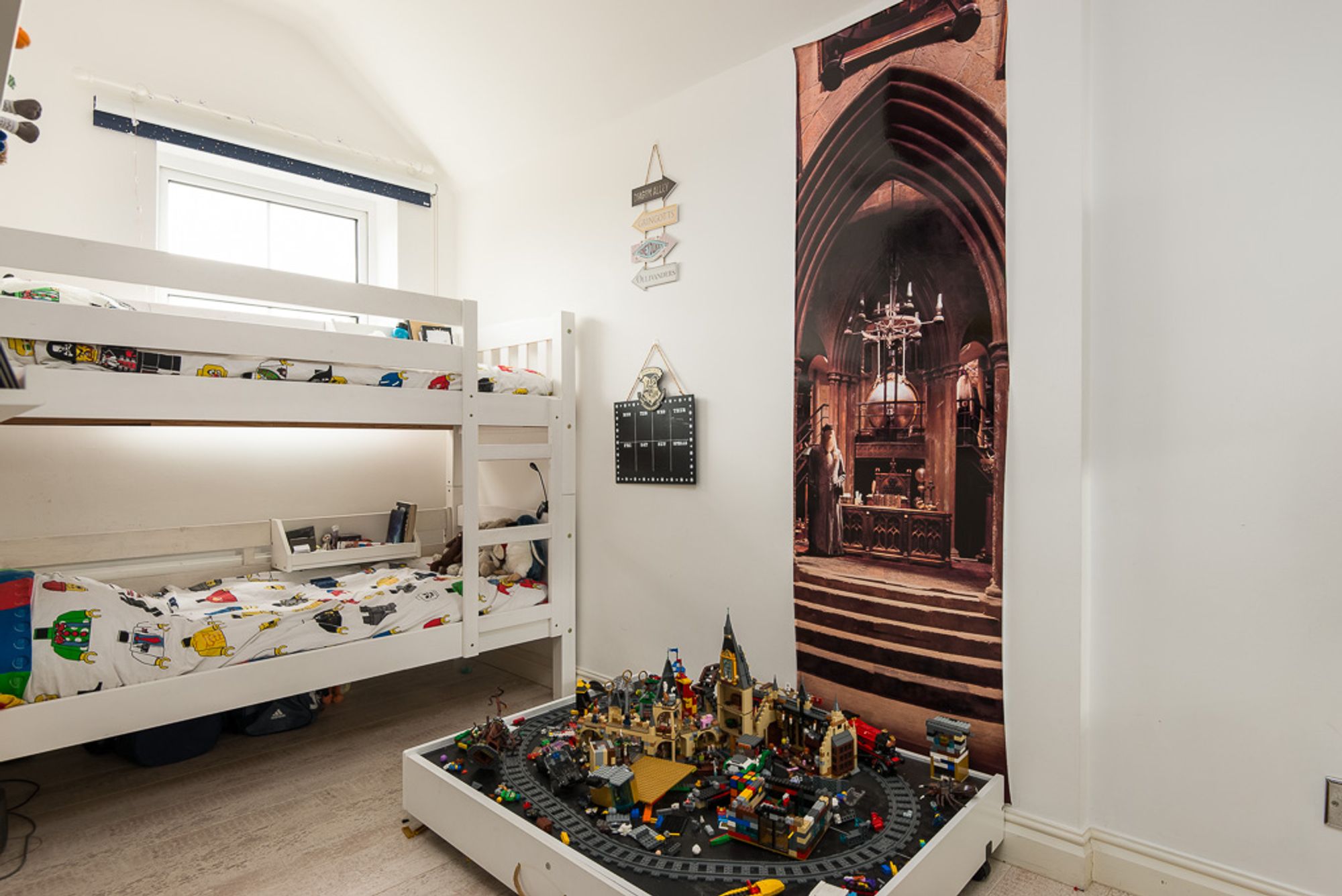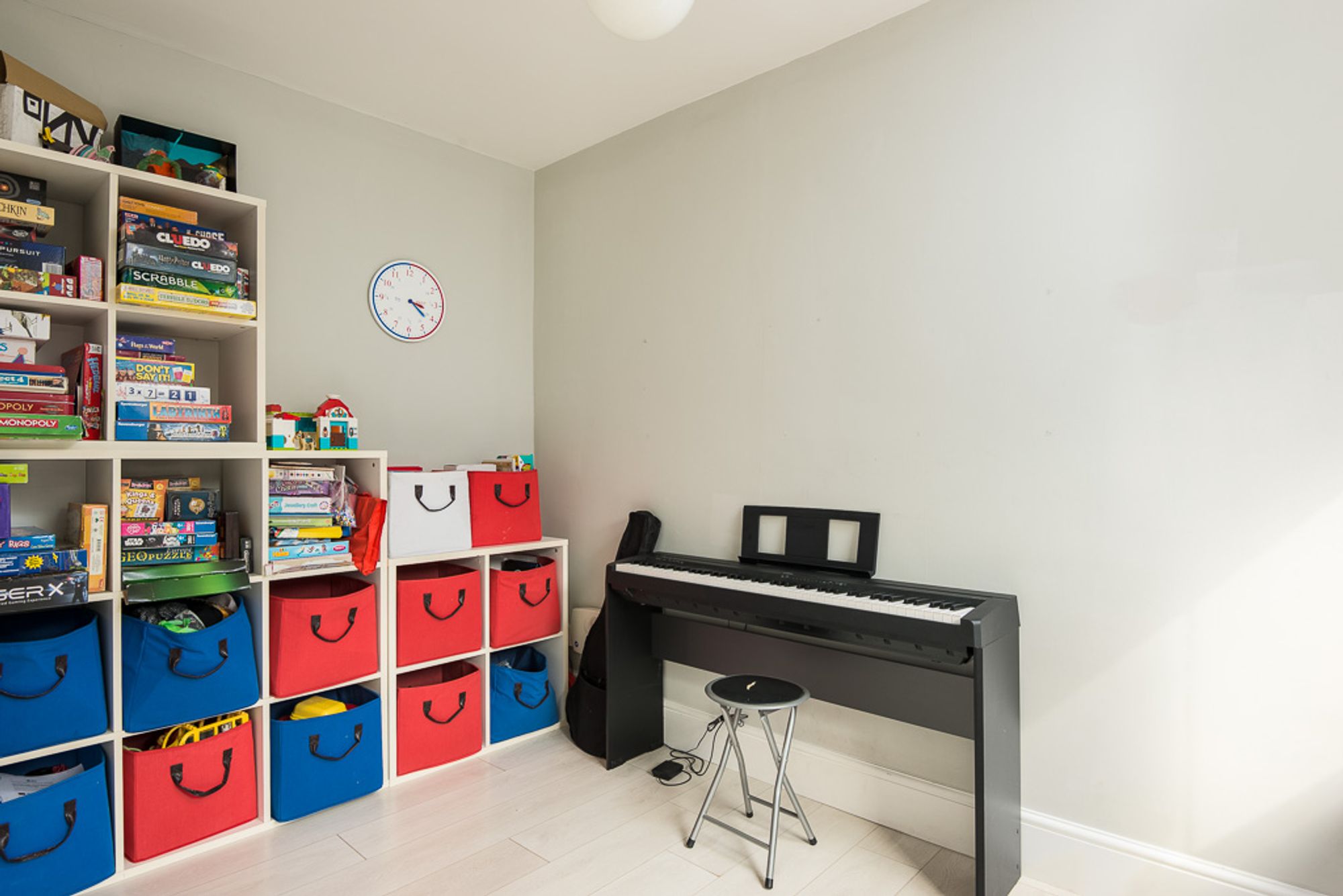Bedroom 2 is a bright and comfortable room with light wood flooring and a peaceful outlook over the rear garden. Bedroom 3, a well-proportioned single, continues the same light and airy aesthetic, making it an ideal space for a child, home office or dressing room. Both rooms benefit from playful touches and abundant natural light, ensuring a warm and welcoming atmosphere throughout the first floor.