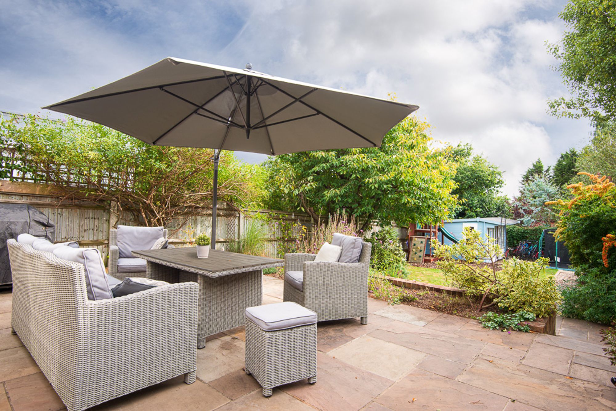The property features an expansive landscaped garden with a raised terrace ideal for dining and entertaining. A central lawn and mature shrubs create a peaceful, family-friendly space. Pathways lead to the summer house, completing a seamless blend of practical outdoor living and tranquil relaxation in a private, picturesque setting.