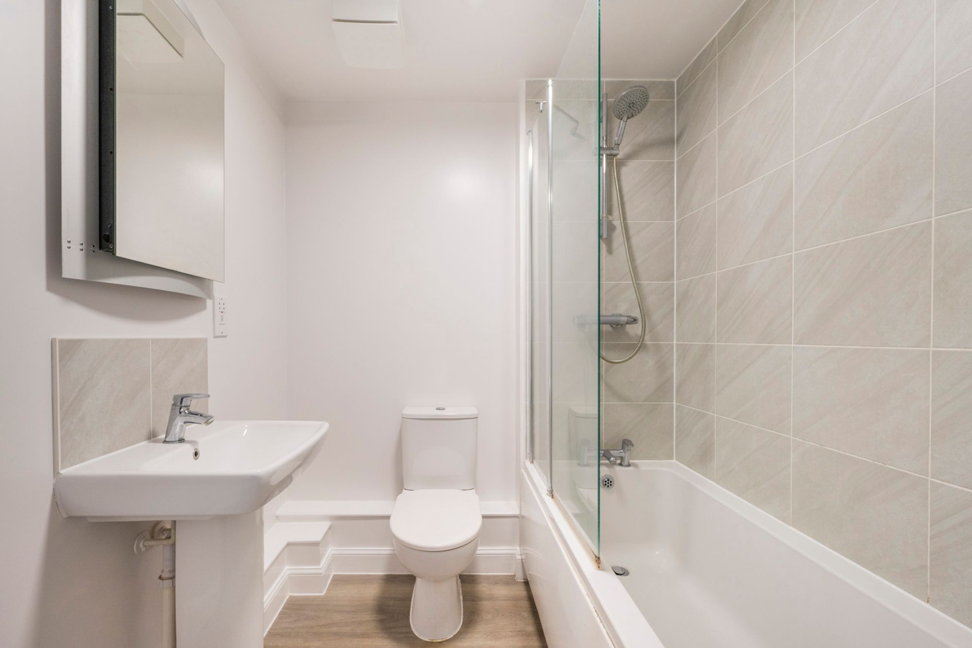 Continuing the sleek aesthetic, the bathroom features a clean white suite and matching tiling that serves as a fresh, blank canvas for you to add your own personal colour palette through plants or plush towels. It comes fully equipped with a bath and an overhead shower, ready for a quick morning refresh or a long soak. Completing the space is a designer mirror, adding a final touch of contemporary style to this move-in-ready home.