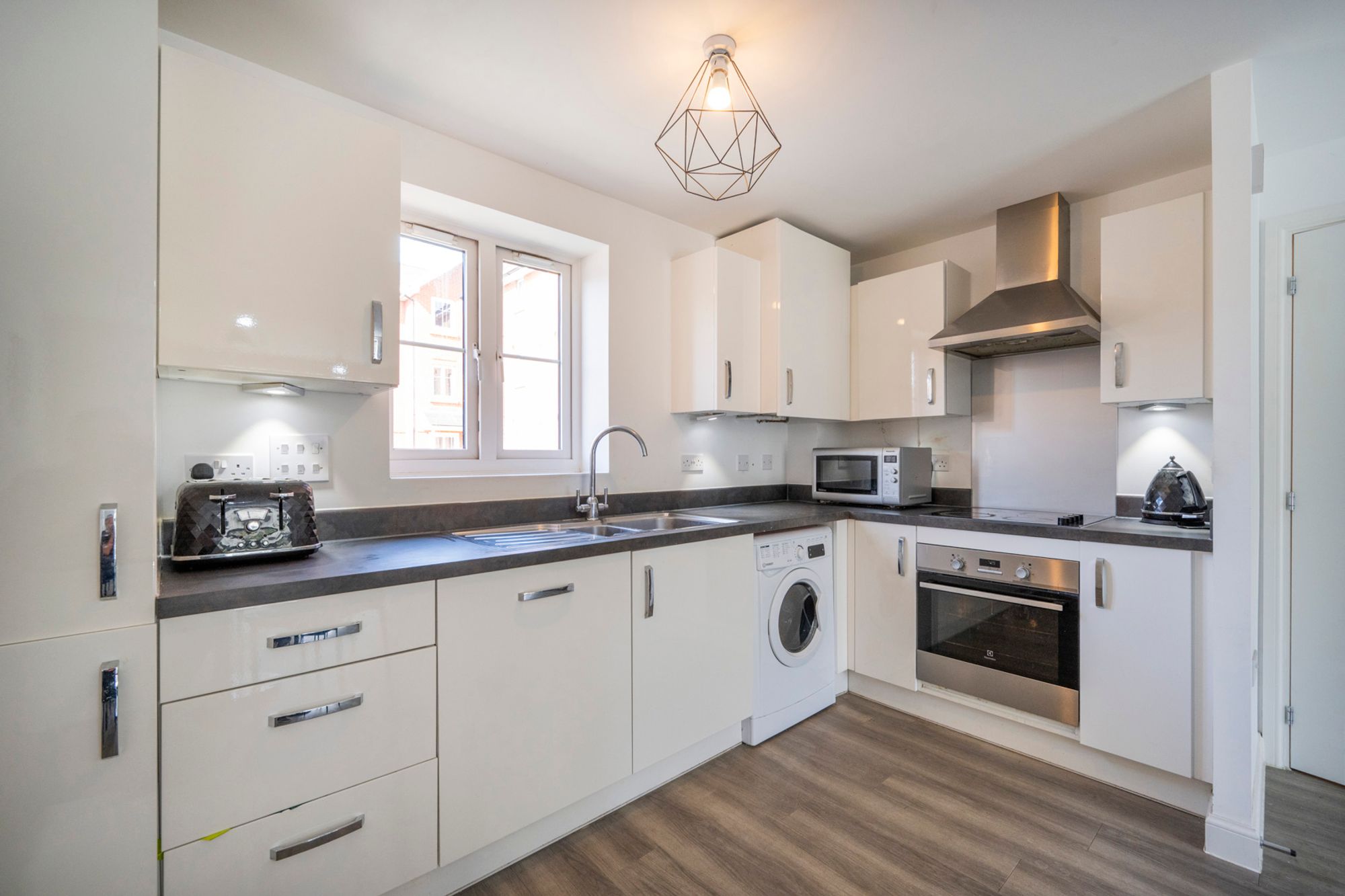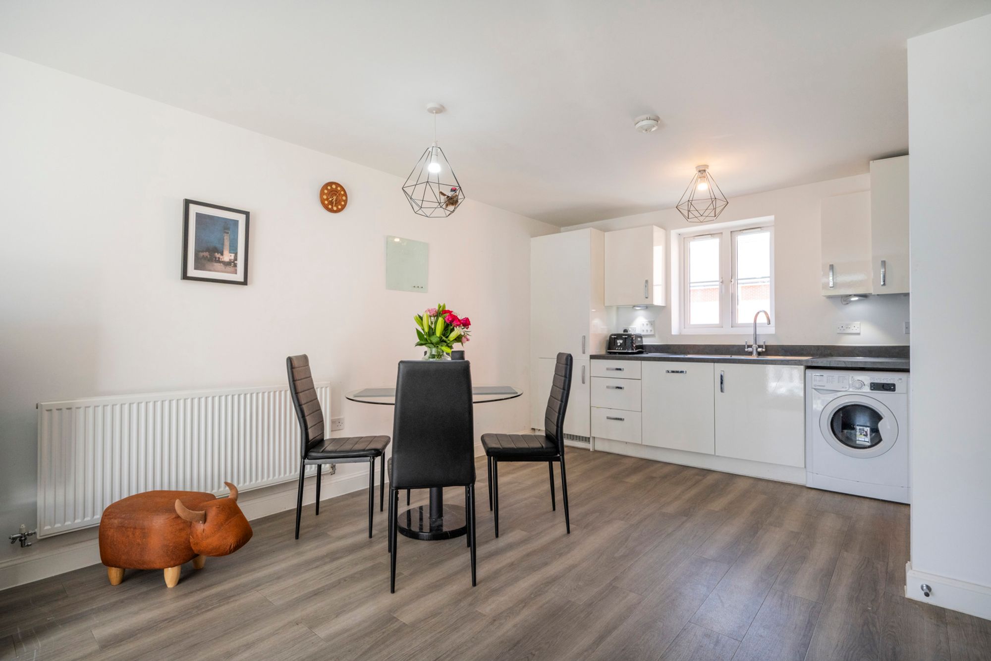 Flowing naturally from the living space is a modern, open-plan kitchen that combines style with functionality. The clean white cabinetry is accented by contemporary silver handles and houses a full suite of appliances, including an integrated oven, hob with extractor, and a built-in washing machine. You will also find a generous 70/30 integrated fridge freezer, ensuring plenty of storage for the week's groceries. With its continued wood-effect flooring and streamlined layout, it is the perfect kitchen to rustle up some HelloFresh or Gusto meals while staying part of the conversation in the living room.