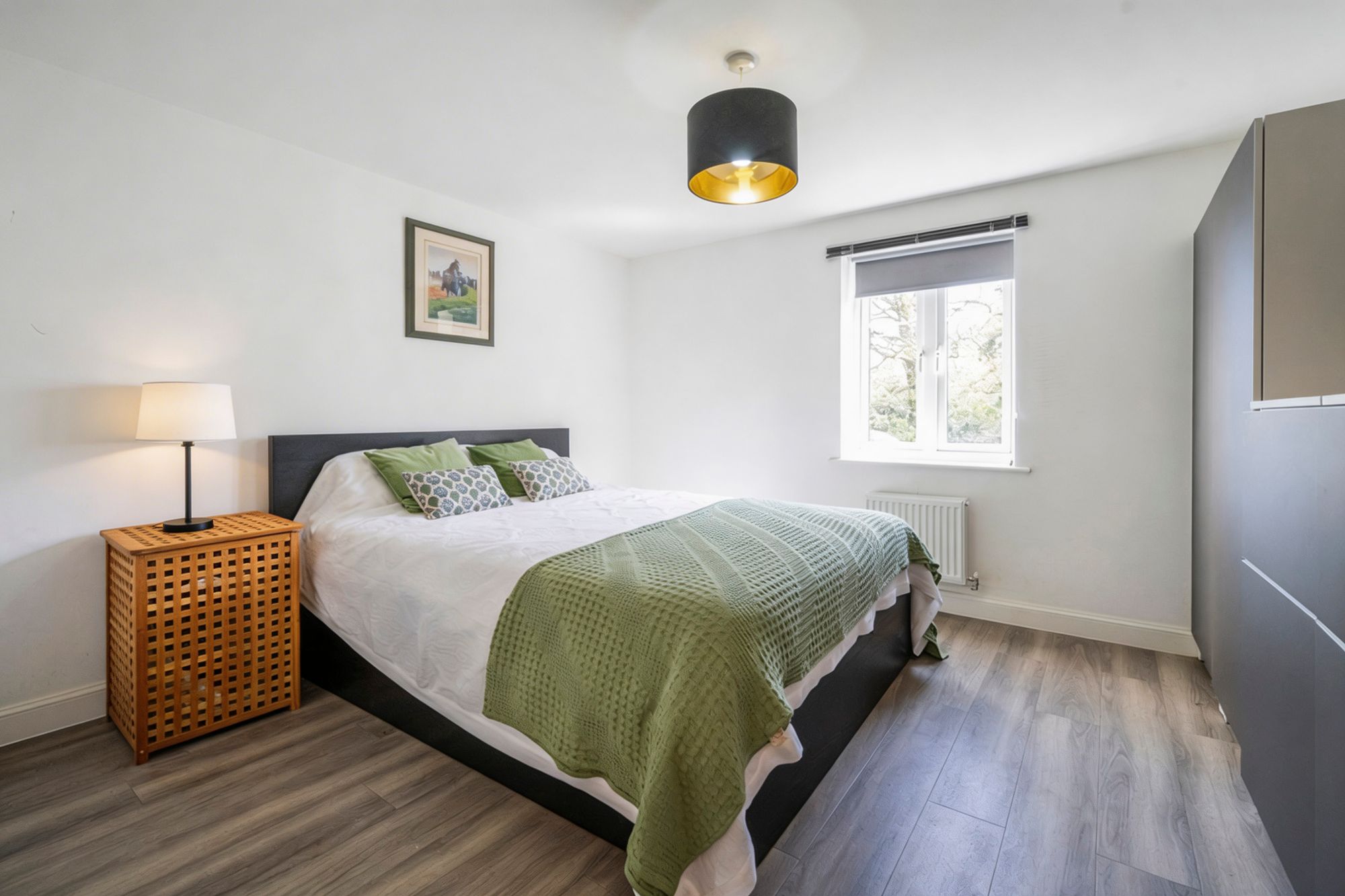 The bedroom is minimalistic chic, featuring consistent wood-effect flooring and a crisp white colour palette that creates an instantly calming sanctuary. A large window offers a leafy view of the nearby trees, bringing a touch of nature indoors while you relax - the perfect environment for a restful night's sleep after a busy day in town.