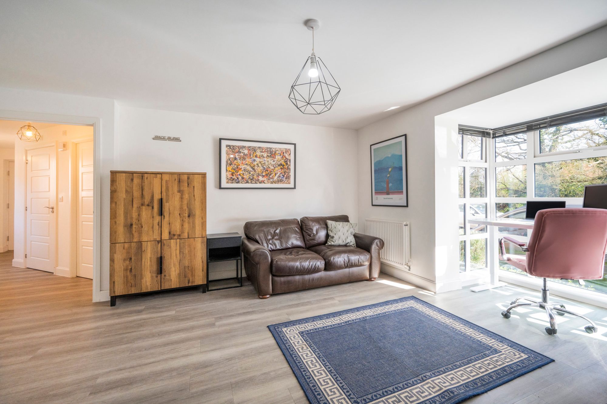 The living and dining area is a masterclass in open-plan design, anchored by stunning wood-effect flooring that flows seamlessly throughout the space. The real showstopper is the floor-to-ceiling glass bay window, which floods the room with natural light and creates a bright, airy atmosphere. Tucked into this sun-drenched spot is a unique alcove currently utilised as a home office, offering an inspiring workspace with a view. The crisp white décor enhances the sense of space, making the sleek dining area—perfectly positioned between the kitchen and lounge—an ideal hub for entertaining friends or enjoying a quiet dinner.