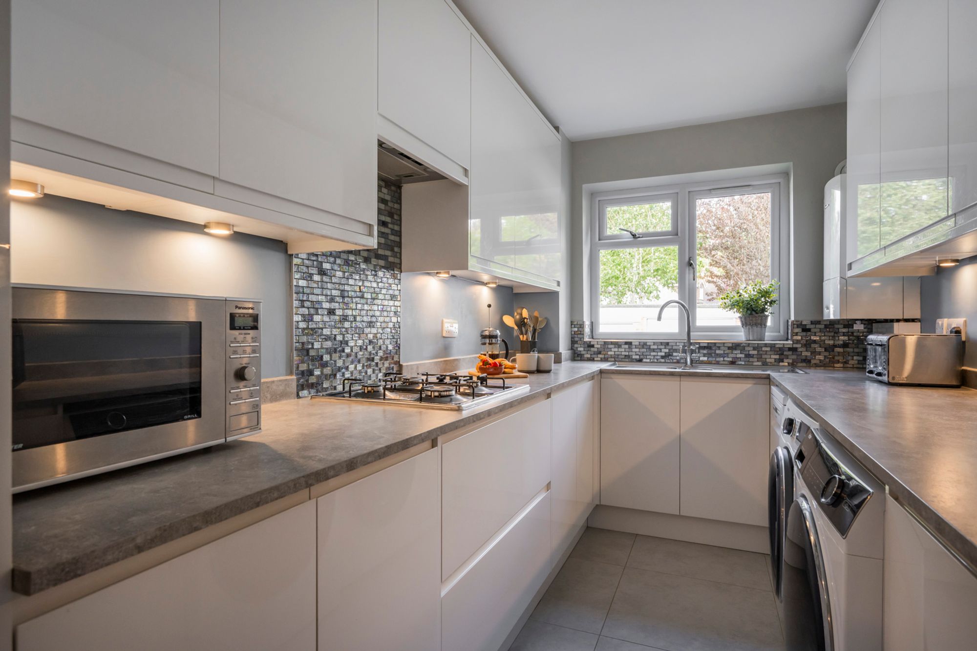 The modern Kitchen is equipped with glossy units, integrated appliances, and a mosaic tile backsplash, complemented by under-cabinet lighting and a large window for a bright, inviting atmosphere. Bedroom One features a an en-suite Shower Room for added privacy. Additional bedrooms are equally inviting, with good storage, ample natural light and contemporary decor, making them suitable for family living or a home office. Residents enjoy access to a landscaped communal garden and off-road parking with the property having a large Garage. This apartment combines modern comforts with attractive outdoor spaces, making it an exceptional opportunity for those seeking a tranquil yet stylish home in a convenient location.